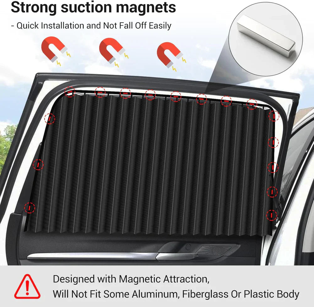 Simply place the curtain's magnetic edge against your car's metal window frame. Attaches in just 5 seconds. Adjust position as needed for best coverage.
